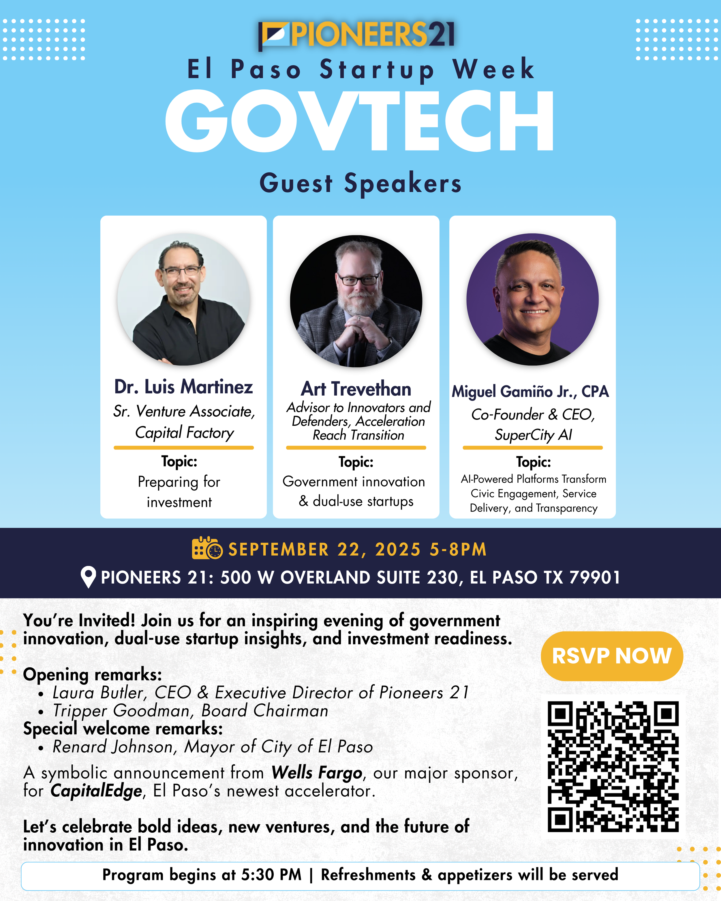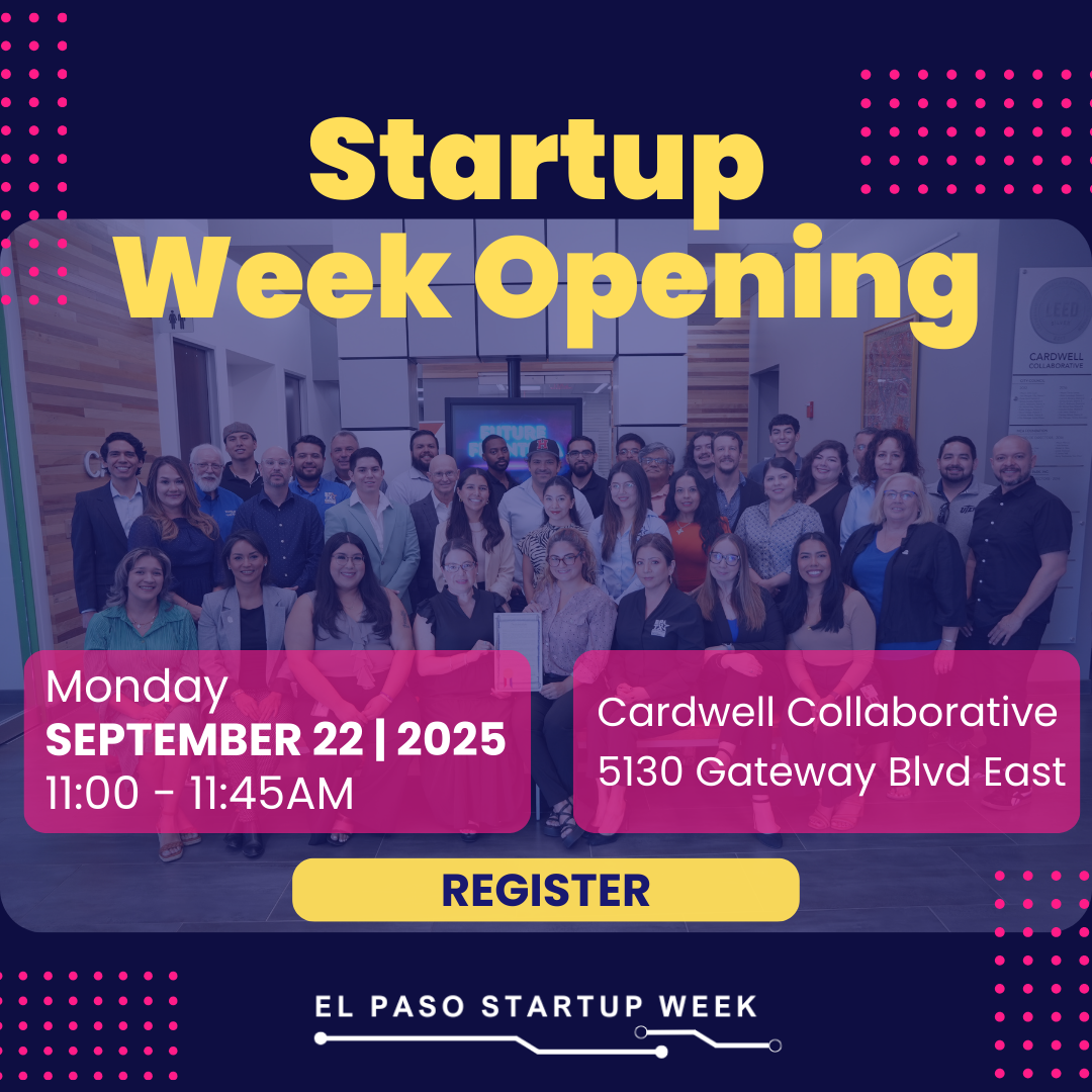 El Paso Startup Week 2025 wrapped up on September 27 after an incredible week of innovation, collaboration, and community. From September 20 to 27, more than 35 events took place across the region, including El Paso, Horizon, and Las Cruces. Entrepreneurs, students, and local leaders came together to share ideas, learn, and connect. The week showcased the growing strength of our borderland startup ecosystem and the people driving it forward. Thank you to everyone who joined us for making this year’s Startup Week one to remember. We cannot wait to see what next year brings!